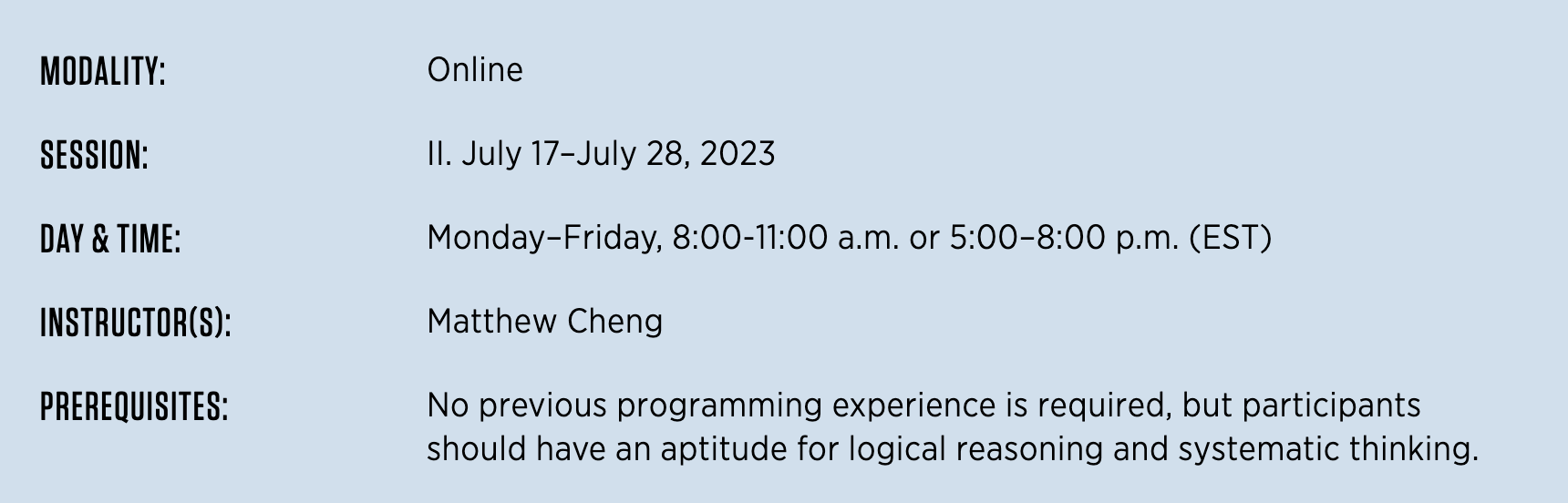 An intensive course designed to develop logic and programming skills through immersion in the fundamentals of C. Programming projects involving mathematical problems and word games challenge students to develop their logical reasoning, systematic thinking, and problem-solving skills. Students learn the structure and features of a fundamental programming language as they implement solutions in C. In addition to teaching programming techniques, the course will cover an overview of fundamental computing concepts such as data structures, library design, and memory management.